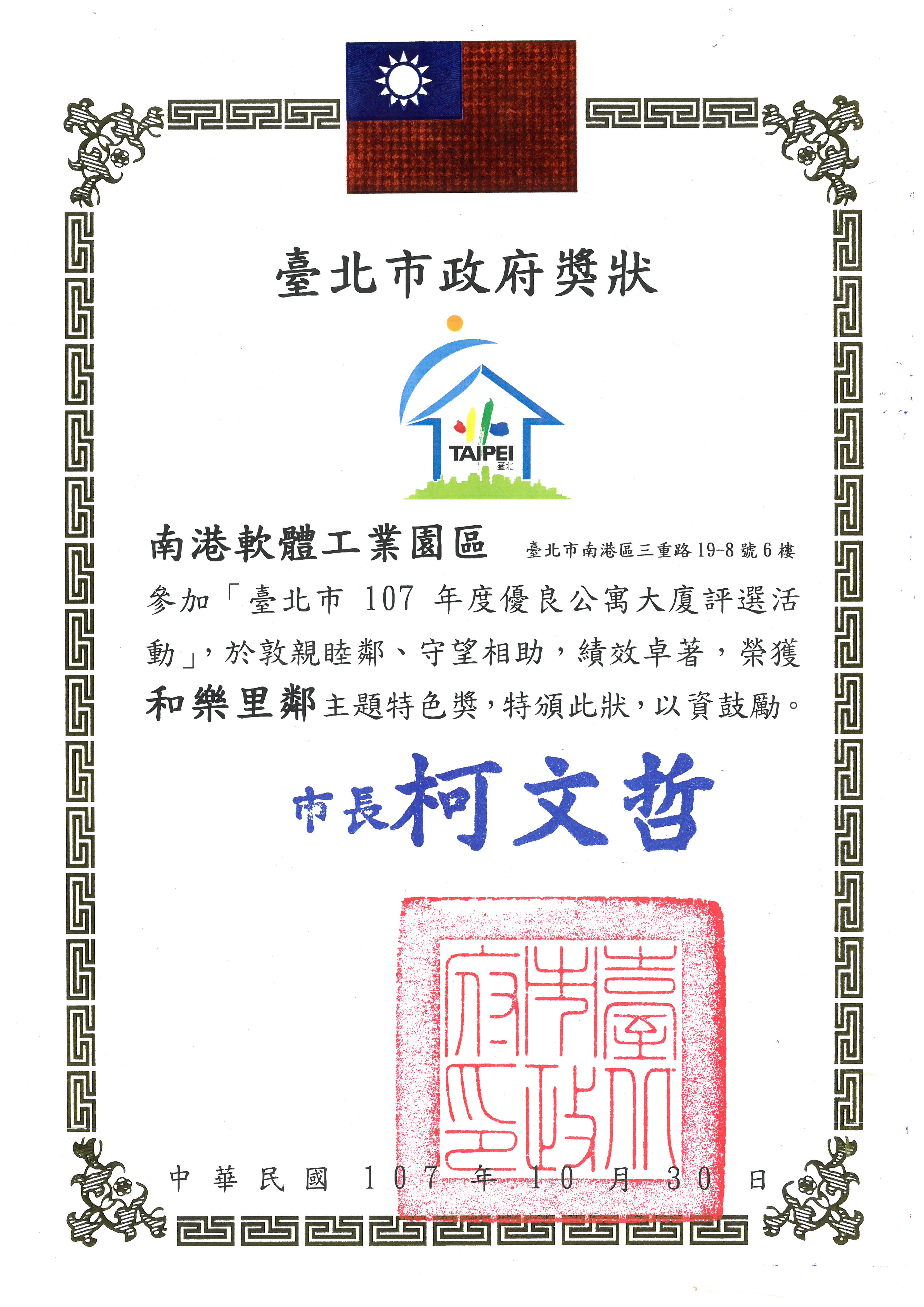 台北市107年度優良公寓大廈評選活動和樂里鄰主題特色獎