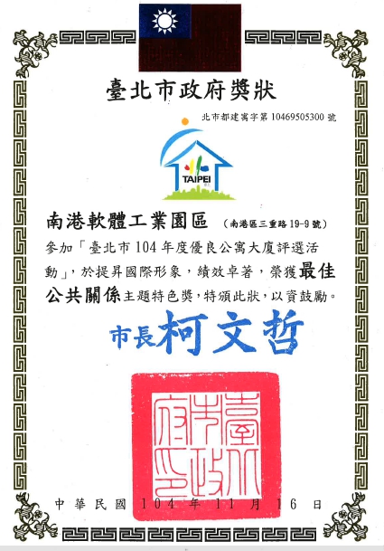台北市104年度優良公寓大廈評選活動最佳公共關係主題特色獎