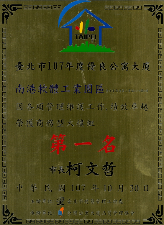 台北市107年度優良公寓大廈評選活動商務型大樓組第一名