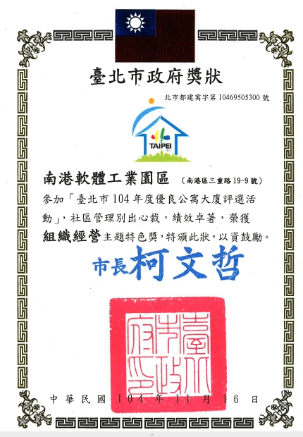 台北市104年度優良公寓大廈評選活動組織經營主題特色獎